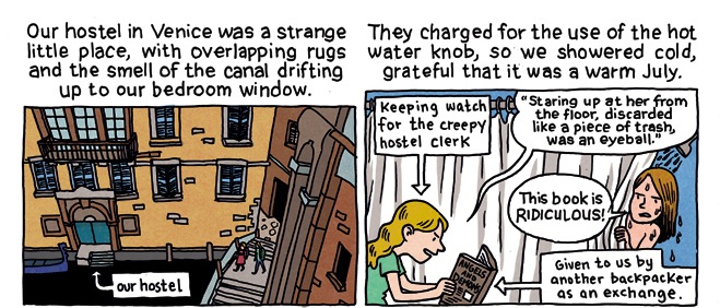 It also helps that the book wasn’t only about cooking. There was a lot about family, and friendship, and growing up, and of course just little moments that Knisley managed to capture from her life. My particular favorite involved a crappy hostel in Venice, where Knisley’s friend read out pieces of Angels and Demons (received in an exchange with another backpacker) to Knisley while she tried to shower in cold water (as it cost money to use the hot water). I love that Knisley shouts about how ridiculous the book is, as I felt the exact same way. (And woohoo, I found a picture online of this particular moment!!)
