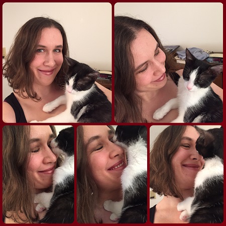They began on Monday. My September Ipsy glambag arrived! This month, unlike last month, I loved nearly everything I received. The brow powder did me no good – my eyelashes are so thick and dark that even the darkest powder made no change – but the eyeliner and eye shadow were both amazing. The body lotion was a bit overpowering in coconut scent, and I prefer to keep using my cocoa butter. The moisturizer, on the other hand, was quick-absorbing and smelled amazing, like Fruity Pebbles, ha! Since my cocoa butter smells like Cocoa Pebbles, I’m a fully-Pebbled person right now, heehee. Additionally, my kitty loved the smells, the colors worked really well for my skin tone, and I got this great collage of makeup-me and purring-kitty out of all this: