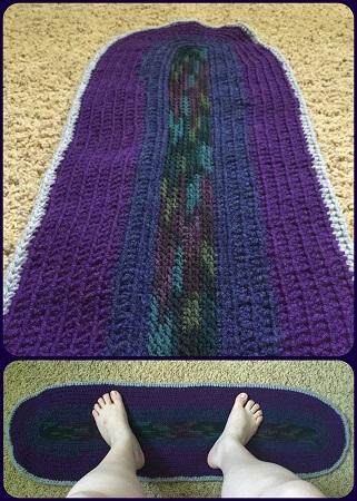 This was my first in-progress project. It was meant to use up extra yarn that I had lying around, with the intention of fitting under my desk. Now I have it at home, and it fits perfectly!