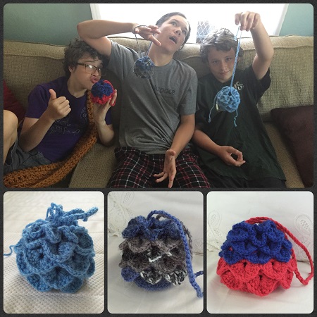 Lastly, the boys all got excited about Jason’s dragon-egg dice bag and wanted ones of their own. I hurried to make these in the last day of our trip (making my hands a little sore!!). The boys each picked out their own colors from what I had available, and they were all super excited about how they came out.