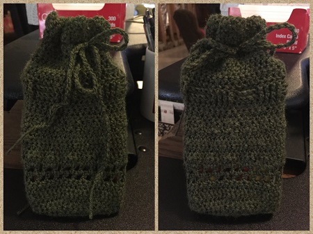 My second in-progress project was another tarot bag. I have four tarot decks, and two of them had bags already. For my last bag, for my third deck, I designed the pattern from scratch. This time, I decided to follow a pattern, and honestly, I wasn’t happy with the results (which is why I’m not linking out to the pattern here). My first attempt was with size 4 yarn (pattern didn’t specify a size or gauge!), and by the time I got a third of the way through, it was the size of a three-month-old’s head. It made a nice hat that will go to my future nephew or niece (due September). So the second time, I used a size 1 yarn, and that turned out to be too small. I had to add a whole bunch of extra stuff in the middle to get to the right height for my tarot cards. Even beyond that, it’s a circular pattern, so it doesn’t quite fit the box of cards all that well. Still, it’ll do. It’s for my least-used deck anyway.