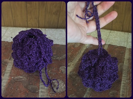 This was another One Skein Wonders pattern, an asymmetrical-close bag. This was an extremely simple and quick pattern to follow. It only took a couple hours to put together, and it’s all one contiguous line, with no need to join or sew lines together. The mesh bottom of the bag is sturdy and stretchy, making the bag a perfect size for a trip to the library, a quick grocery run, an individual swim kit, or an overnight bag. On the other hand, I’m not a huge fan of the asymmetrical handle. It’s kinda cool that it slips through to close, but I’d rather have two long handles. The good news is that I had enough of this blue shiny yarn (thanks Karen!) to make another this size with two longer straps! (not pictured)