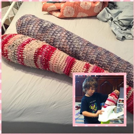 Love-bat. Story behind this one: When Ambrose turned 10, Jason and I found this bizarre stuffed pink thing that looked vaguely baseball bat shaped at the thrift store. Ambrose has always loved the feel of crocheted things, so we bought it for him. You can see, in the insert, his marvelous reaction, and he still owns and loves the item alternately known as the pink worm, pink maggot, and love-bat. I crocheted a purple love-bat to match it for his 14th birthday! At his party, he pulled out both bats and began a kind of pillow fight with them…