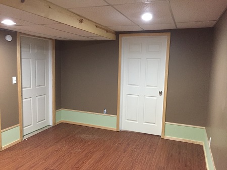 As I mentioned in the first link above, our original basement consisted of a finished master bedroom with walk-in closet, a finished family room, and two partially-finished rooms. We planned to update the ugly family room, including expanding it into a section of the current utility room, and add a bathroom. Flooding caused us to also do some repairs/revamps to the master bedroom, and to basically redo the walk-in closet altogether. (Sidenote: who puts paneling over non-moisture-resistant drywall directly over cinder block basement walls?? All that stuff had to go!)