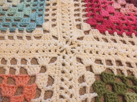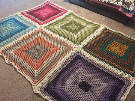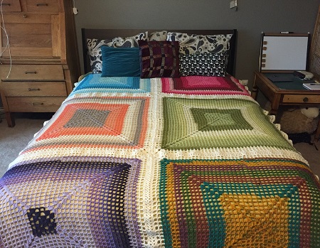 All connected, the joins worked well, though I ran into two problems. 1) My giant skein of yarn – 858 yards! – was about one yard too short. Thankfully my son had a skein that was nearly the same color and only slightly different in texture, so I fudged half of one side of one square. You can’t tell unless you know where to look. Whew! 2) My initial single crochet edge was too tight, causing the squares to pull at the corners. After the braid join, this led to wavy edges, longer corners, and bunched up sections where the corners met. Unfortunately, this is something that can’t be fixed with blocking. It’s simply an excess of yarn in places. I know what I ought to have done differently – and hey, if I had, I wouldn’t have needed that extra couple feet of yarn – but what’s done is done, and it’s pretty enough on a bed even with the wrinkles.