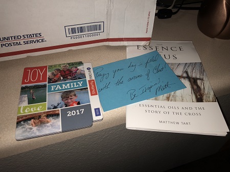 On Tuesday when a package arrived. It was a package we expected from Jason’s dad, so at first this didn’t seem weird. True, it had those plastic bands around it like they have around very heavy boxes, but I didn’t think much about it. The box was supposed to have Jason’s wedding ring, which he’d accidentally left up in Wisconsin the last time he was there. When we opened it, though, the contents were weird: Two chocolate bars from Aldi – that’s exactly something we’d expect. A stack of six identical fridge magnets featuring a clutch of kids we’d never met – um…what?? A booklet entitled “The Essence of Jesus: Essential Oils and the Story of the Cross” – now I know Jason’s mom is religious and likes essential oils, but this just doesn’t seem her kind of thing… Lastly, no wedding ring, which was supposed to be inside a sealed envelope.