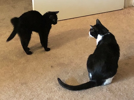 Unfortunately, things didn’t go as well for our other two kitties. Nimi is the sweetest soul, and she immediately tried to mother Jojo by bathing his face. He responded by attacking her over and over until she gave up on him. We never seen or heard Nimi hiss, growl, or swat at another creature before. Not once. After she gave up on Jojo, all three behaviors came out. Now, Jojo won’t attack her anymore, but she also won’t let him near her. If he comes close, she attacks him. This is the cat who will calmly sit there and purr while Gavroche pretends to dominate her by putting her throat in his mouth. Jojo can’t be within a foot of her without her attacking him, and really, vice versa. They have an uneasy truce of dislike.