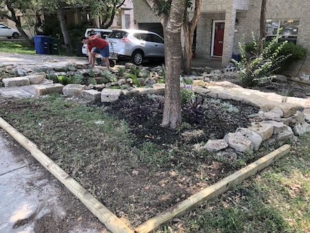 So yeah. Yesterday morning was frustrating, waking up to water everywhere and a messed up kitchen ceiling. But I’m tired of days just going to hell because of things outside my control, and decided to do what I could to make this an awesome day. While we waited for our insurance people to send out the cleanup crew, the family went outside to begin the next phase of our landscaping project. The boys hauled rocks, Jason built rock walls, and I troweled up a small ditch along the sidewalk and walls to put in a wood border. My arms/wrist are sore and I have a few blisters, but the result was nice: