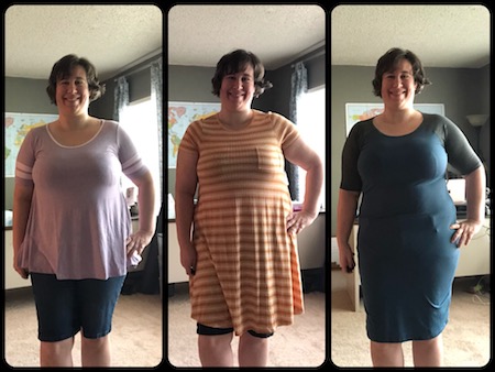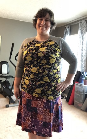 Third photo: This is an XL Julia dress. The Julia is one of the LLR pieces that run very small and you’re supposed to size up 1-2. I bought this one for the design (raglan sleeves!), sized up 1. Again, I can wear it, but it’s tight all through the top and it shows off every lump and curve. I look stuffed into it. This one will take the longest time to fit into of these three, the most weight to lose, but I’m hoping to be there by Nov/Dec when the weather is cool enough for these longer sleeves.