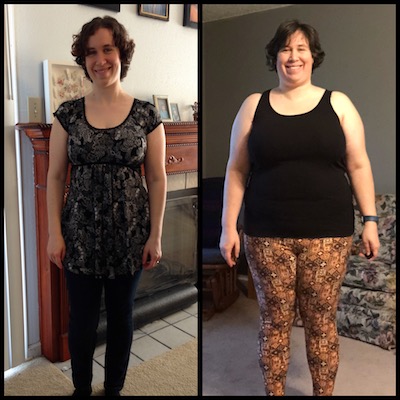 Beyond that, I’ve been taking daily photos since July 10th, wearing a pair of leggings and a cheap ribbed black tank top from Walmart. The top and bottom both will cling to my body and show its shape 100%, so that as I lose weight, I can keep longterm comparison photos in similar outfits all the way down. Yesterday, the day after my binge, I looked at my daily photo. It wasn’t much different from any of the days before, of course. I wasn’t expecting it to be. But while I looked at it, a photo popped up on my laptop, which rotates photos from my files every half hour. The photo was of me right after my birthday trip to the thrift store (for fun outfits) in 2014. And seeing those two photos together was a really huge wake up call.