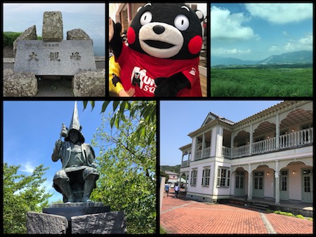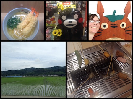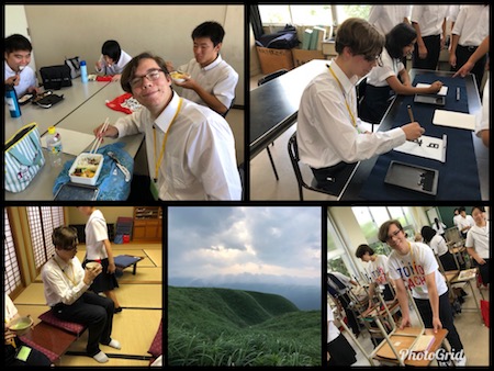 They did all sorts of things – a tea ceremony, calligraphy classes, some kind of weird race to see who could clean the floor fastest (??), a trip up the local mountain, meditating on the side of a cliff (!!!), hanging out in a hot spring bath, visiting local temples, dolphin-watching, going to the Studio Ghibli store, etc. He saw hilarious shirts like the Nike one that said “Just F*ck It” on the back (no asterisk, of course). He went to restaurants where they had a pot of boiling oil to dip sticks of Vienna sausages and bacon pieces into (ha!). And everywhere he went, he met up with the giant mascot of Kumamoto, Kumamon. Here are some of my favorite pictures that don’t involve the other kids on the trip, since they aren’t able to give permission to post: