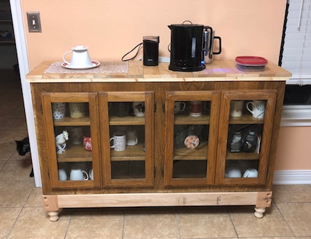 Ignore the open space by the window. We plan to build bench seating and a coffee bar in that area, but we’re going to wait until finances recover before doing that! (Temporary coffee bar setup below! This is the part that didn’t cost any money, haha!) The last photo in the above collage is a detail of the maple/black walnut butcher block countertops, which we really love!
