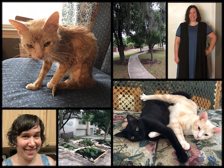 We unexpectedly adopted two cats, Jojo and Atticus, bringing our household cat number up to five. Things haven’t been easy. The two factions (the three former cats vs the two newer cats) tend to catfight, literally. But Jojo in particular has made great strides from a traumatized terrified kitten to a mostly-loving, relatively-calm cat. And while the strain of having five of them is overwhelming at times, I adore all of them and am happy to have them in my life.