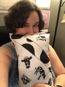 11. I’ve had a “cow-pillow” since I was a senior in high school. I was never a fan of cows and I didn’t use any kind of chest/stomach/body pillow back then, but my boyfriend at the time liked both. I found this ridiculous cow-print handkerchief and made it into a pillow for him. The foam I stuffed it with smelled AWFUL though, so for a week before I gave it to him, I used it as a body pillow to try to negate the smell. (That didn’t really work, notably.) After using it for a week, I was hooked. I bought another cow-print handkerchief and made my own pillow. Only then, I left my pillow in a hotel in France while studying abroad when I was 20. Later that summer, I was in Ohio for my dad’s wedding and found the exact same cow-print handkerchief in a five-and-dime store. !!! I made myself a new one. A few years later, I bought a pack of 24 identical cow-print handkerchiefs off ebay. Now, I make myself a new cow-pillow every couple years as the previous ones get old and smelly and lumpy and flat. I even made one for Laurence once at his request. I shall never be without my cow-pillow!!