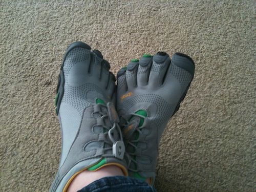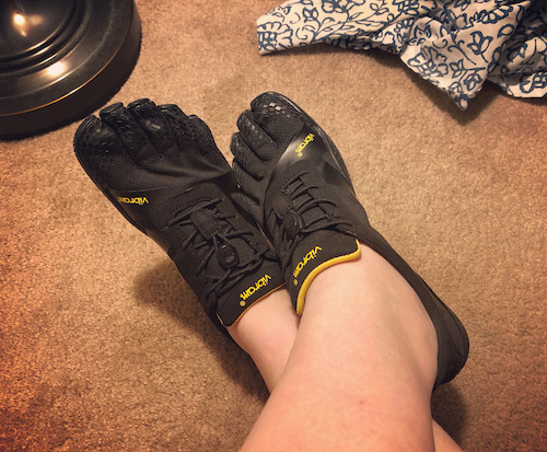 So last week I was dithering about carpet vs rugs vs no area to run etc etc in our living room. Everything felt way up in the air with a lot of decisions to be made. A lot can happen in a week! We’ve been going flat-out getting our house ready to put on the market, and we’ve been looking at houses to buy – many of which don’t have carpet in the living room, because everyone hates carpet these days except me. Either way, I was looking for solutions that wouldn’t eat up a lot of money (in this house or a new one, if it didn’t have carpet in a large, downstairs room for me to run in). And on one of the days Jason and I were driving to showings, I suddenly remembered how back in 2011, I bought a pair of Vibram five-finger shoes.