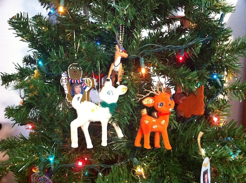 As you can imagine, these ornaments got really beat up over the years. They became discolored. They lost patches of “fur” and some of their stickers. When Becky and I left home, I took Faline with me (I can’t answer for Rudolph). Faline was so forlorn alone on my tree that Jason and I found a partner for her. It was also a hollow red deer with sticker eyes and “fur,” though it looked slightly different from the original Rudolph. Faline didn’t mind. Tradition continued, and the two deer remained at the front of the tree.