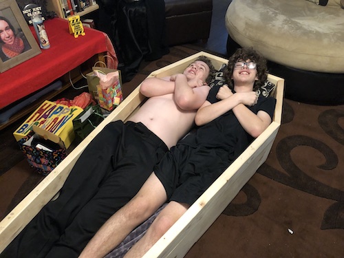 2) Laurence and Ambrose squeezed into my buzzard party coffin (March)