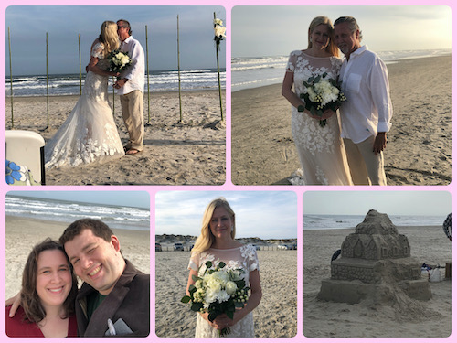 I won’t hash over all the details from the wedding itself. I’ll just say that it was a beautiful ceremony, with perfect weather, and a small group of friends and family gathered. Of course, I got lots of photos, and can’t wait to see the ones the professional photographer took. After the ceremony, we all went to eat at a nearby seafood-and-pasta restaurant (delicious!), and the next morning, we had breakfast tacos over at the newlywed’s beach rental. Jen and Robert organized everything so well. Their rental was was right next to the group hotel, and only half a mile from both the restaurant and the wedding location. Jason, the boys, and I walked everywhere instead of needing to drive, which just made the whole weekend that much more perfect.