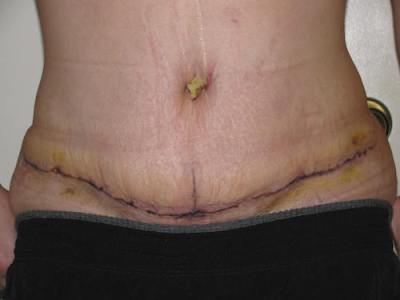 The main problem: Part of my surgery was never completed due to his lies. Essentially, a section of skin still needs to be removed from my abdomen, but since it’s purely cosmetic, I didn’t spring for the extra cost he presented to me. However, I now believe that the surgeon expected me to go through this secondary surgery, and didn’t sew up that section of my scar very carefully in the initial surgery. Most of my scar healed perfectly, but this six-inch section in the middle – the section that was meant to be cut away, the part that bulges down in the photo – has a gigantic mound of scar tissue under the skin that itches and gets inflamed often. There’s some concern that there may be a seroma or some pockets of fluid/bacteria that is causing inflammation in my body. Additionally, the sewn-together muscles in my abdomen still have a lot of rip-like pain whenever I stress them, which is abnormal.