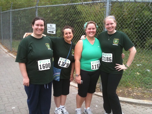 Fast forward to 2011: In January and February that year, I completed Couch to 5K indoors and could now run for 45 mins straight. I signed up for a 5K in March to try to run one officially. A few fellow Sparkers (from Sparkpeople) also signed up for the same 5K. During that event, I discovered that 1) indoor running and outdoor running are very different things, and 2) I was running more up/down (like running in place) than forward. Still, it was my first 5K where I both walked and ran, and I came in with a time of 53:54. Ha. It was also a good marker for me in time/weight – I’d lost 25 lbs at that point from my highest weight. That 5K was the Shamrock Shuffle.