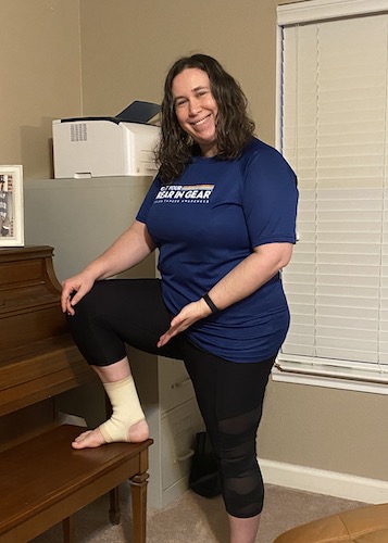 So that’s where I was at on Saturday, foam-rolling and icing like a mad-woman, because I REALLY wanted to walk this 5K on my birthday!! Sunday morning, I immediately put on a compression sleeve over my ankle (see above photo), and made sure my shoes were on tight. A few videos of me walking barefoot and in my shoes showed me the issue. These shoes are made for hiking, and while they’re called trail runners, they’re not supportive enough for my troublesome feet when I run. I roll outward – a problem I’m trying to slowly correct – and so my foot is literally shifting so that I’m walking on the outside edge with the shoe almost diagonal on my foot. The compression sleeve (for support) and the really tight laces were crucial for the day’s 5k. And I still knew that I might not make it.