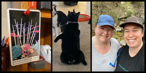 Left to right: the extra card from my Modern Witch Tarot Deck, which really sums up the current world situation for me; Jojo chasing a toy and looking like a huge dork while doing so; tradition selfie for Stephanie and me while on our hike to Government Canyon
