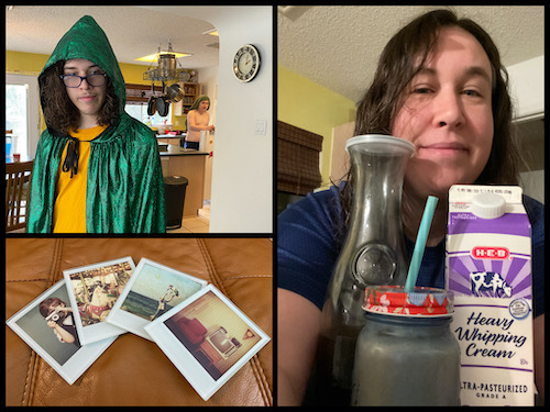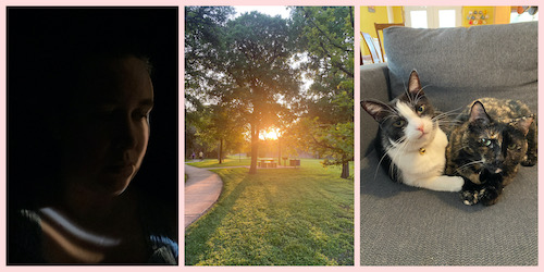 Left to right: self-portrait of anxiety-induced isolation; sunset at Friesenhahn Park; Gavroche and Nimi cuddle together