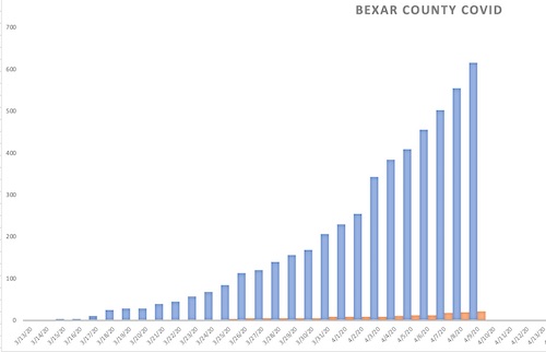 Local count: 503, 18 deaths, 77 recovered. We had a big spike in our death numbers here today, though not an actual spike in deaths. It turns out that the nursing home that had a massive outbreak due to lax precautions was also hiding the numbers of folks who died of COVID in their care. Almost half of SA’s death toll has been from that facility, as well as almost a fifth of confirmed positive cases. It’s unbelievable. That facility needs to be SHUT DOWN, but sadly it’s state-governed and not under the jurisdiction of San Antonio. Sigh. Otherwise, Texas closed down all the state parks and historic spots, including walking trails, until further notice today. At home: It is really odd to take care of someone from six feet away. Jason has entered the digestive-distress portion of this illness, and I feel so helpless standing “nearby” to ask if he needs anything, washing my hands multiple times throughout the course of helping him get food or water, dropping Tylenol onto his plate or into his hands without touching him. Stress and worry are compounding, particularly as I’m not only acting as caretaker, but taking over the things he normally handles (cooking, for instance) and full-time responsibility for Ash (who has remained steady-but-not-improving for the last two months).
