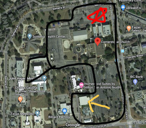 The church is described in Texas Monthly as having a 17,000-membership congregation (and that was in 2006), with “a large (5,400-seat) sanctuary, classrooms and office buildings, a prayer chapel and garden, a gymnasium and racquetball courts, and acres of parking.” (again, 2006). In the above picture, everything surrounded by the black line is part of Cornerstone (I included a little section for the pastor’s personal ministries building, too.) Ambrose and I parked around the star area. We needed to be in the building where the yellow arrow is.