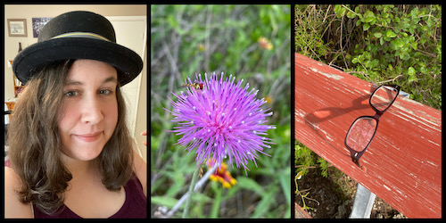 Left to right: dressed up for Zoom; purple wildflower with tiny wasp on top; someone left their glasses on the park bench…