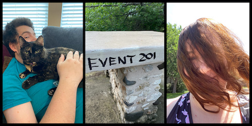 Left to right: coral snake seen on my run; Gavroche works at Jason’s computer; “life finds a way” (grass growing out from a crack in the rock)