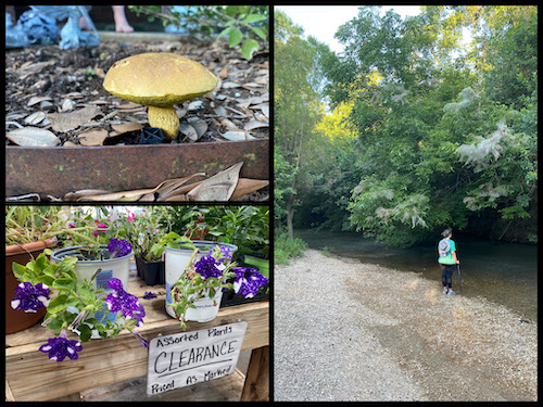 Top left: a giant mushroom that sprouted in our yard. Bottom left: night sky petunias at Menards. Right: a fellow hiker taking in the scenery