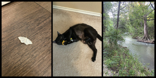 Left to right: a white moth on a wooden floor; Ash playing with a catnip toy; Medina River Natural Area with gorgeous Majestic Bald Cypress trees.