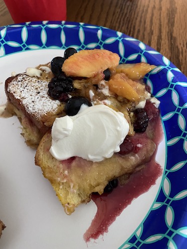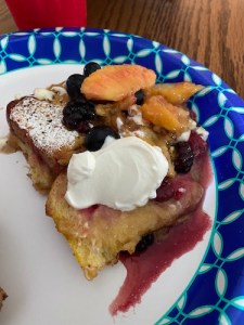 Afterwards – and after stretching, showering, more stretching, and more stretching – I ate this amazing breakfast of stuffed French toast with all kinds of fruit, plus a cinnamon bun for good measure. Who needs mini-Oreos, eh? I’ll save those for another time!