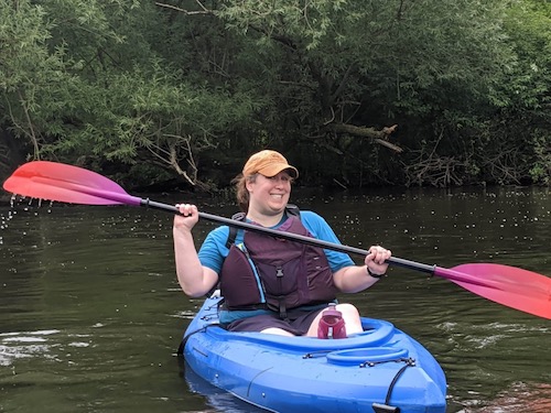 Last weekend, my extended in-law family got together. Guests who were able to come included Jeremy (Jason’s older brother), Emmy (Jeremy’s wife, who I met in person for the first time), Tenille (Jason’s older sister), and Xarissa (Tenille’s daughter, my niece). Plus three additional doggos. There were walks, board games, lots of food, and general fun, but the big event was the kayaking. This part of WI is filled with lakes and rivers (hence the high humidity), and kayaking is a big thing. I last kayaked in 2012 because somehow I never did in the 2016-2017 year that we lived here. The boys last kayaked in 2016. Everyone was pretty experienced at this, even if our experience was a few years old. The river we went on was pretty shallow and had a low, lazy current. There was no reason for our trip to go chaotic, and yet…