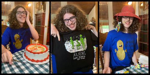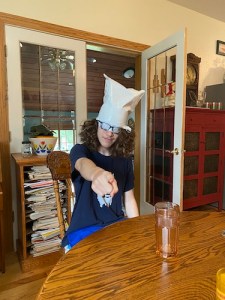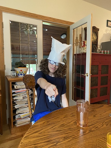 Yesterday, Ambrose turned 18. Two of my three boys are “officially” adults now. It was a very low-key celebration day. We had a birthday breakfast of sausage-egg-and-potato burritos. Ambrose discovered that in this household, the tradition is to find money in your breakfast. He got $1.80 in various change for his 18th birthday. He loved this and was laughing the whole time, and then opened up his gift from his grandparents: a shirt with a picture of a peanut on it, with the words, “Whoa! Stay back! I’ve got a people allergy.” Just last week he was talking about having a hard time making a birthday list, because he only wants “weird things like a shirt with peanuts on it.” It’s classic Ambrose, and he was delighted with the gift. And with the wrapping, which he turned into a “hat/mask.”