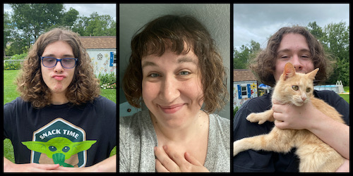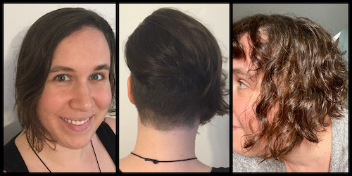 We figured this would be best to do in Wisconsin, in a county that’s had fewer than 100 cases (as of then, anyway), than to wait to do this in San Antonio again! My FIL recommended Fantastic Sams in Rice Lake, where they do an excellent job with safety: no bags/purses, max three customers, wait outside until called in, masks for everyone, etc. Ambrose cut off 5-6 inches, to get the deader ends off and make care easier while staying long. Laurence got his trimmed slightly and thinned out so there’s less poof. I decided to go a little extreme. I went back to my favorite haircut ever – an undercut with an inverted bob that I had in the summer of 2016 – only I also got bangs.