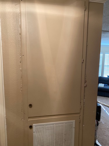 That day, he drained our old water heater first, to remove it. (Meanwhile, Atticus escaped the house and trotted back five mins later with a newly-dead bird in his jaws. He was quite upset, with a lot of hissing, when Jason took the bird away from him!) When Jason tried to remove the old, empty water heater, a pipe that had connected it to the a/c unit above disintegrated. So he had to call out a plumber/HVAC specialist. The guy arrived and fixed up the pipe so that they could at least have water in the house, if not hot water yet. The next day he returned to install the actual heater. Only 1) it turns out that while the hardware store sells this style of water heater (the squat kind for a lower cabinet, which is now against code but our house is grandfathered in), it doesn’t sell drip pans wide enough for it. That’s a specialty item that must be ordered. And 2) the closet was built around the water heater, so in order to get it out and put the new one in, they had to remove part of the wall. UGH. Pan was acquired and water heater installed on Monday, leaving just the wall to rebuild and the cabinet door to put back on. Jason finished this on Tuesday. In the pic, you can see where there will need to be wall-patches and paint. Sigh.