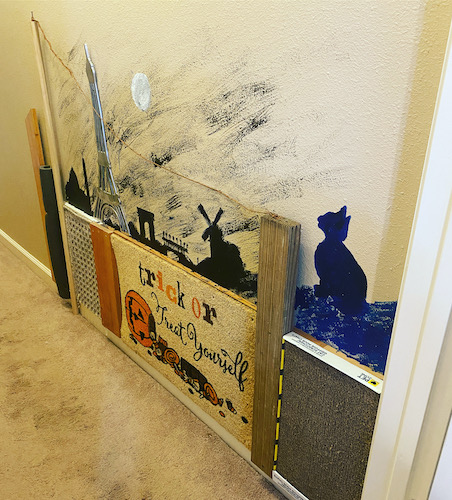 Build a cat wall (for scratching!): 8/8 – I’ve wanted to do this for ages and finally we got it on, and on International Cat Day, no less! It looks awesome and includes cardboard, carpet, rough turf scratchy material, foam, three kinds of wood, and a wire to hang cat toys from. Not to mention Jason’s awesome freestyle painting!