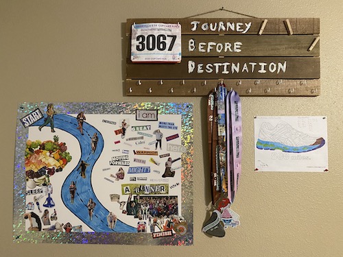 Finish my runner’s board (for bibs, medals, motivation, etc): done 8/8 – This is a project that I’ve wanted to do for ages now, but didn’t have all the things I needed to create it. Jason gave me a bunch of the individual items (like hooks) as one of my Christmas gifts, but my original attempt at a board background got inadvertently destroyed by one of my kids, and then the pandemic kept me from acquiring something new. I kept debating with different ideas, shifting around as I saw other runners’ boards, until finally I came to a decision in July. The picture below is the running corner of my bedroom. It has my vision board, my mileage goal, and now my runner’s board with all the bibs I’ve had and medals I’ve earned since the Elf Run 5K in December that started this whole path for me. “Journey before destination” is a nod toward my favorite series, the Stormlight Archive by Brandon Sanderson. Eventually, I’ll get some photos to clip into the mini-clothespins. I absolutely love it!! Can’t wait to get more medals to fill out all those hooks. (Also, those are all finisher medals. I’m too slow for anything else, haha!)