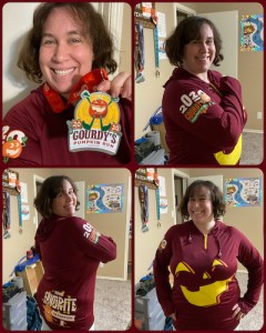 It doesn’t appear that Covid is going to allow any in-person races any time soon, so even though I’m not the hugest fan of the virtual thing, I decided to run a few this fall. First up on my list was the Gourdy’s Pumpkin Run. This used to be called something like the Great Pumpkin Run, and the swag I saw out of 2019 was frickin’ awesome. I was less enamored with the medal this year, but the shirt swayed me. Heh. And I figured this would work well as an “autumn” event for my Running Bingo, since the event evokes images of pumpkin patches and turning leaves and apple cider.