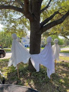 Dress up for Halloween; Celebrate Halloween however covid allows this year: I’ve combined these two because they’re interrelated. And because I had a two-day celebration on the 30th and 31st. It started with a girls’ night out by the Pearl – a small group of hikers walking along the riverwalk with masks, followed by an outdoor dinner by an Ofrenda. I wore my cat domino mask for part of the night. My original intention for Halloween was to go as a black cat and give out candy in a socially-distanced way. However, my hiking group put together a haunted hike at my favorite local trails, so I volunteered to be one of the leaders. The domino mask would have limited my vision too much, so I recycled my skeleton costume from 2018 for the hike (with a sugar skull face mask!). I also put together Tootsie Pop ghosts to stand in a block of foam so that we could give out treats to kids without any contact.