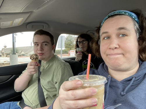 Pre-Lockdown Days (Friday, most of Saturday): Jason left early Friday to head to KS, picked up Morrigan on Saturday morning, and drove back down to TX, arriving around 8pm. While they were traveling, I moved all of our doctor’s appointments from the next two weeks to either before or after our lockdown. Friday evening, my friend Natalie and her husband Chris drove over with a giant box of covid supplies. Her family all managed to somehow survive covid this summer despite their many pre-existing conditions (including asthma and cancer!), and she knew all the things we might need. We’d done our own shopping, but she came with four times as much as I thought we needed and said to trust her. I also did some last minute grocery pickups and the boys wanted to go to Dunkin one last time before we couldn’t for two weeks (above). To complicate matters, our dishwasher broke (wouldn’t drain) for the second time since we got it in August. This means not only will we need to wash everything by hand – meaning that the covid-handled dishes won’t be nearly as sanitized – but we can’t get a workman out for several weeks due to having covid in the house. UGH.