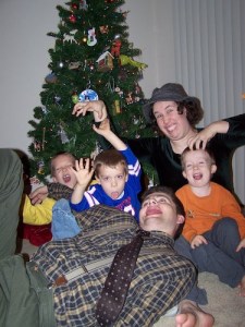 Photo: Christmas 2007, boys aged 7 (Morrigan, in yellow), 5 (Ambrose, in blue), and 3 (Laurence, in orange)