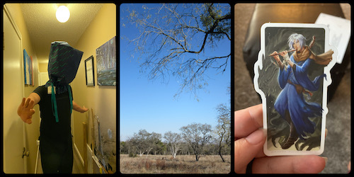 Left to right: Jason walking down the hall with a gift bag on his head – I love this one because it’s the first in a series of three that I took which remind me of a scene from The Way of Kings by Brandon Sanderson; the moon over the scrub at Hardberger Park; my unexpected Hoid sticker (also Sanderson-related!)