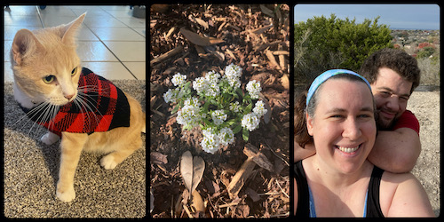 Left to right: Atticus in the Christmas sweater he hates (ha!); new blooms in the garden; Jason’s and my 21st anniversary photo from our hike that morning