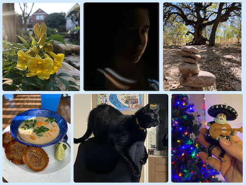 Top, left to right: Esperanza blooming; self-portrait of anxiety-induced isolation; cairn by the giant tree off Salado Creek Greenway. Bottom, L to R: “hipster soup;” Jojo in attack-mode; the most Texan Christmas ornament ever…