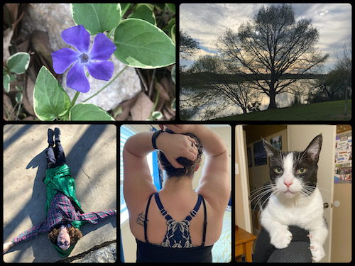 Clockwise from top left: Vinca in the front yard; sunset over Woodlawn lake; Gavroche in attack-mode; embracing my body in every way; one of Ambrose’s senior portraits
