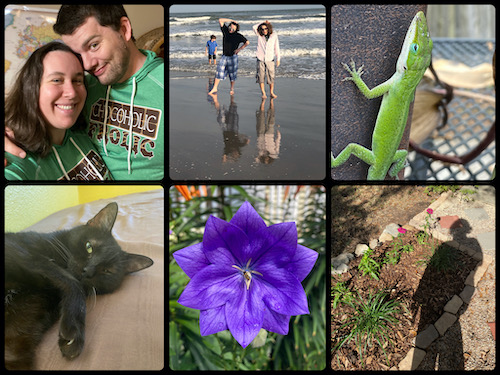 Top, L to R: Jason and me in our matching Chocoholic Frolic hoodies; my boys posing (with reflections) on the beach; lizard! Bottom, L to R: Ash hanging out in the dining room; tiny bee on a beautiful flower; shadow over the new patch of garden.