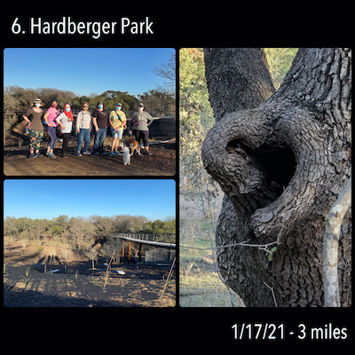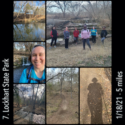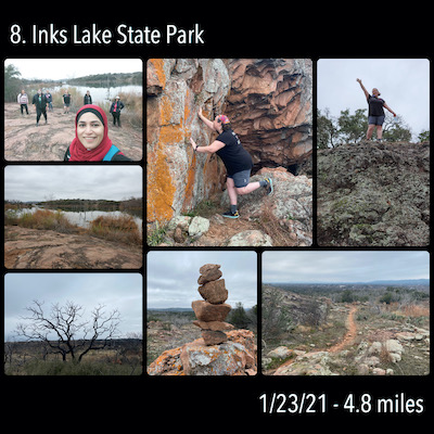 8. This was a leadership hike at a park about two hours’ drive away. Ironically, there was more elevation gain on this hike than my previous one at Lockhart, but all the gain was gradual, so it was a much easier hike generally! We also took it a lot slower, just enjoying the nature around us. We went through so many different areas with vastly different ecosystems – thick trees with ferny underbrush, then clay paths with scrub brush, then giant granite climbing rocks with cactus, or fields of burned trees. I carpooled (masks on!) with Alia for the long drive, and after the hike, our group went to Bluebonnet Cafe in Marble Falls for a late lunch and pie. It was an all-day affair – I woke up at 5:30am, got home around 5:30pm – and exhausting and allergy-triggering (hence my fat-head mentioned last Sunday), but totally worth every moment. [Hike 5/52 for my 52 Hike Challenge.]